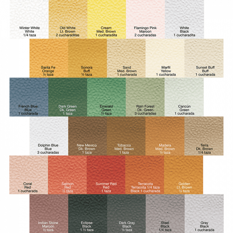 Winter White White 1/4 taza, Old White Lt. Brown 2 cucharaditas, Santa Fe Orange 1/2 taza, Sonora Buff 1/2 taza, Sunset Buff Buff 1 cucharada, French Blue Blue 1 cucharada, Dark Green Dk. Green 1 taza, Dolphin Blue Blue 3 cucharadas, Coral Red 1 cucharada, Indian Stone Maroon 1/2 taza, Cream Med. Brown 1 cucharadita, Flamingo Pink Maroon 2 cucharadas, White Black 1 cucharadita, Marfil Yellow 1 cucharada, Sand Med. Brown 1 cucharada, Emerald Green 1/2 taza, New Mexico Dk Brown 1 taza, Salmon Red 1/2 taza, Eclipse Black 1½ taza, Rain Forest Dk. Green 3 cucharadas, Cancún Green 1 cucharada, Tobacco Med Brown 1 taza, Summer Red Red 1 taza, Dark Gray Black 1/2 taza, Madera Med. Brown 1/2 taza, Terracota Terracota 1/4 taza, Black 1 cucharada, Terra Dk. Brown 1/4 taza, Golden Lt. Brown 1/2 taza, Steel Black 1/4 taza, Gray Black 1 cucharada